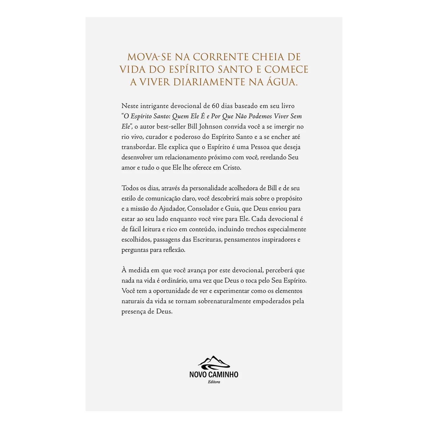 Neste intrigante devocional de 60 dias baseado em seu livro “O Espírito Santo: Quem Ele É e Por Que Não Podemos Viver Sem Ele”, o autor best-seller Bill Johnson convida você a se imergir no rio vivo, curador e poderoso do Espírito Santo e a se encher até transbordar. Ele explica que o Espírito é uma Pessoa que deseja desenvolver um relacionamento próximo com você, revelando Seu amor e tudo o que Ele lhe oferece em Cristo.